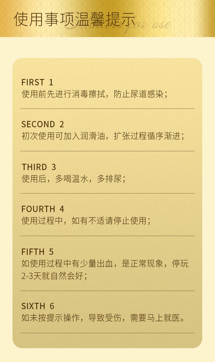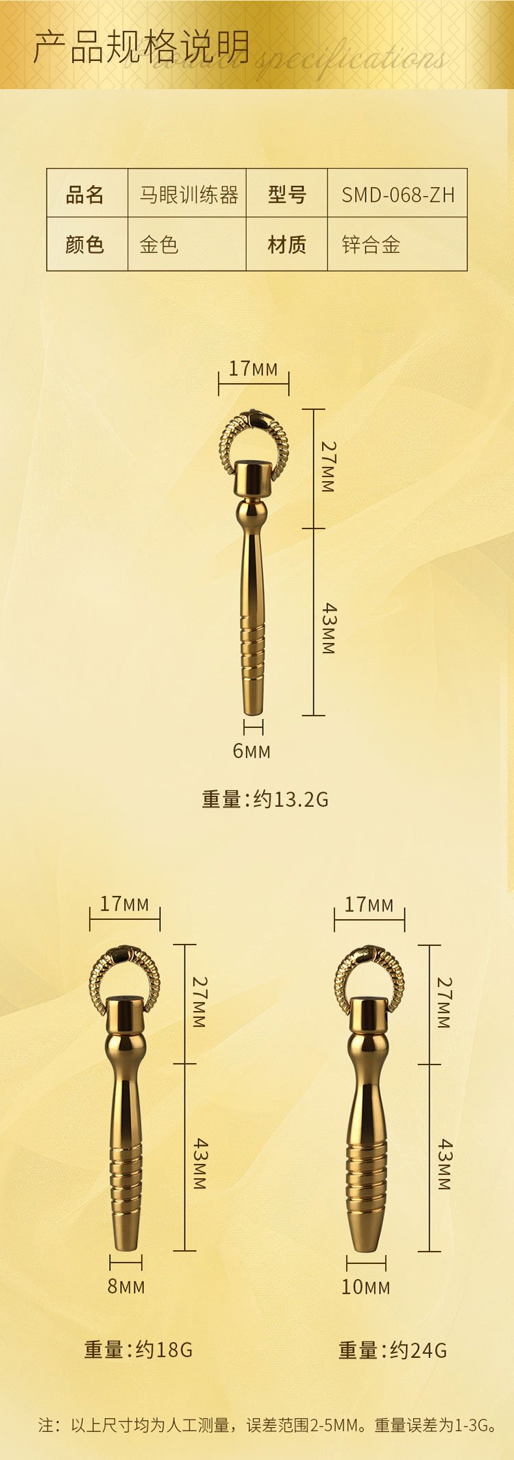 内含:马眼棒6mm*1,马眼棒8mm*1,马眼棒10mm*1 颜色:金色