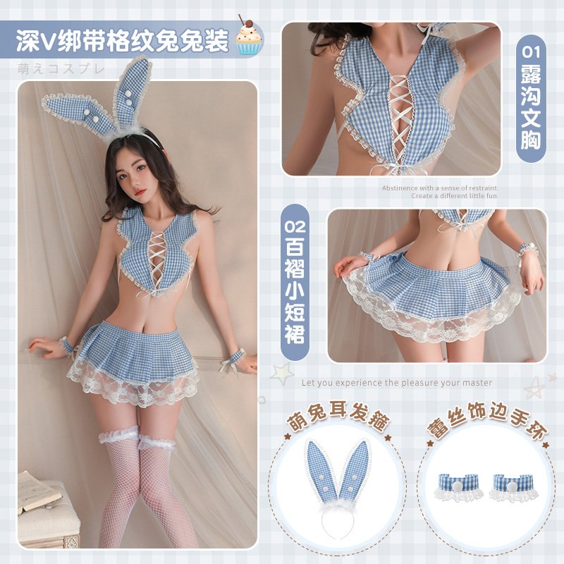 首页 情趣服饰 情趣套装 猫女兔女 深V绑带清新格纹兔女仆装