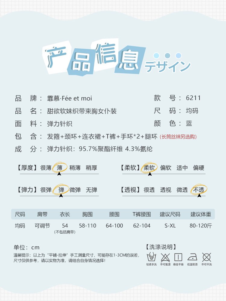 包含:发箍+颈环+连衣裙+T裤+手环*2+腿环