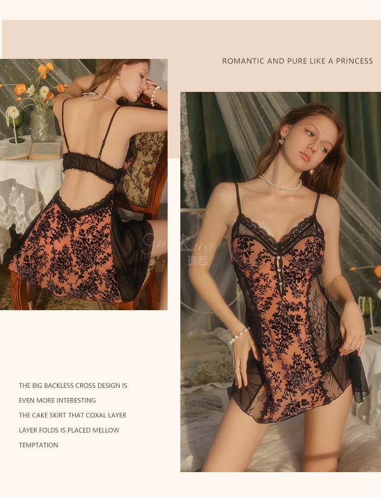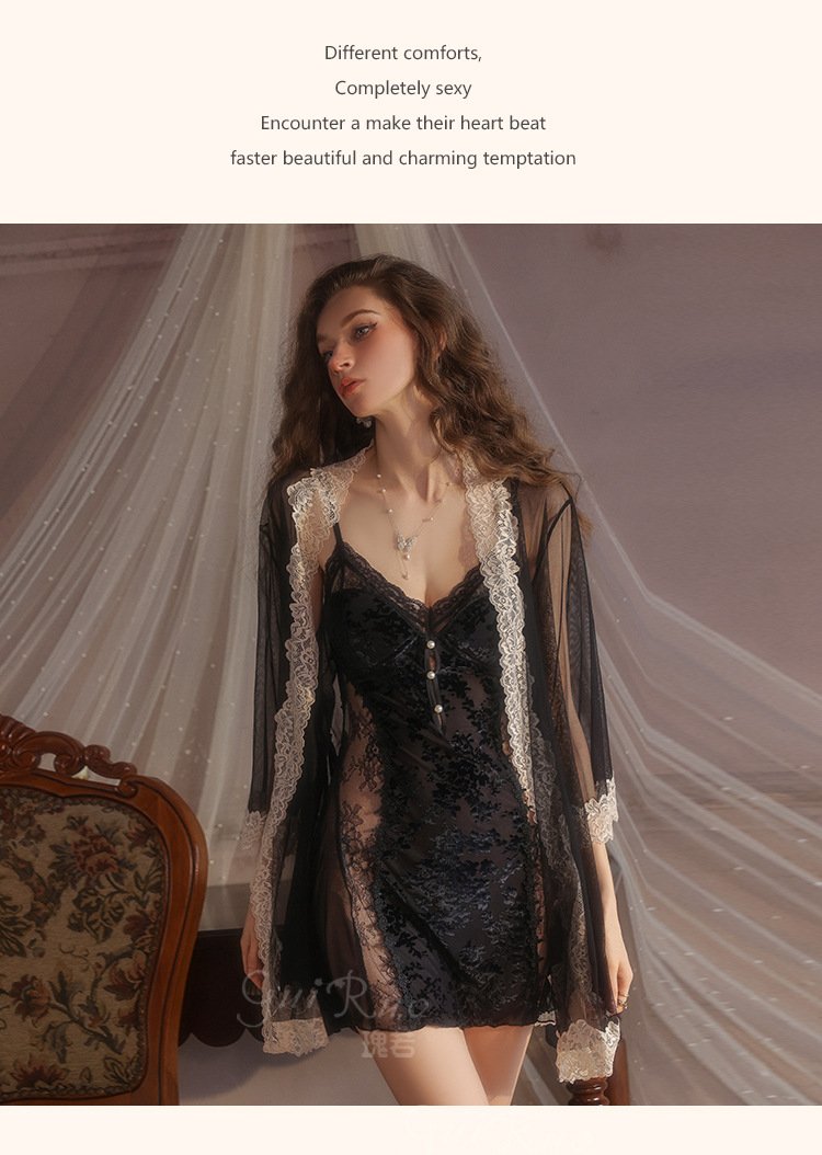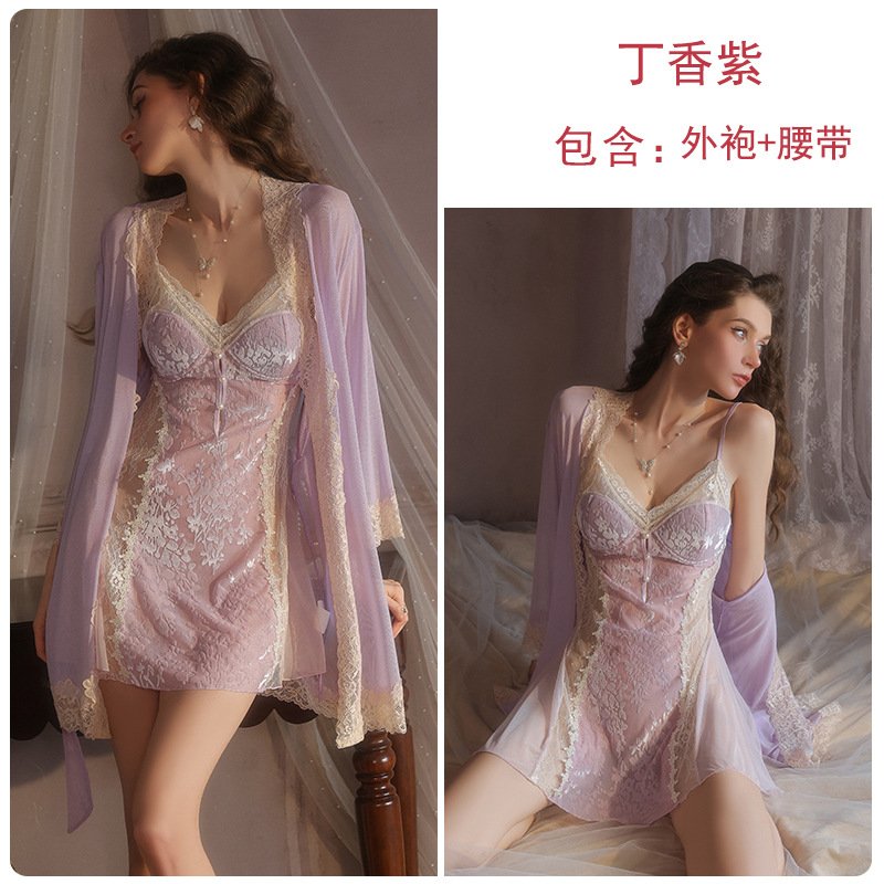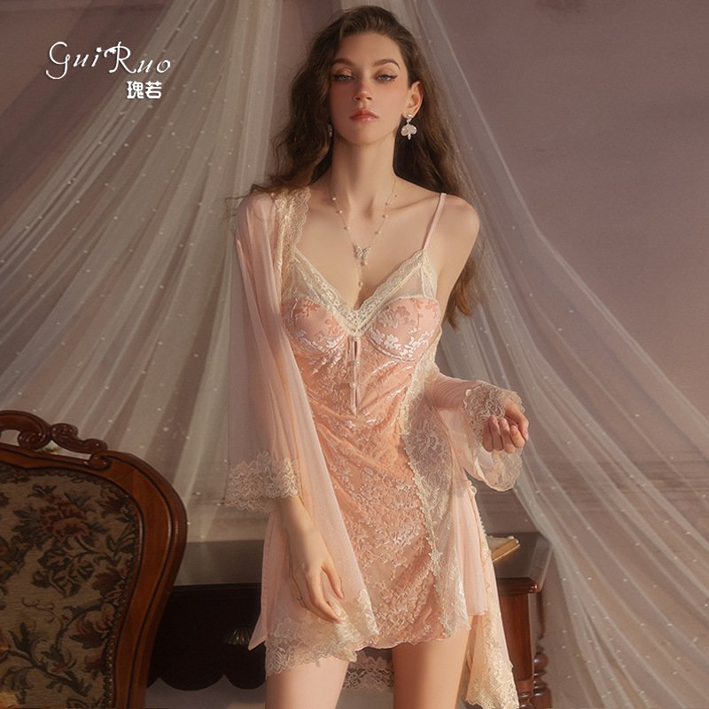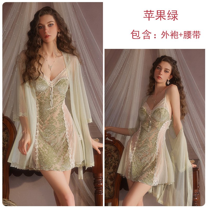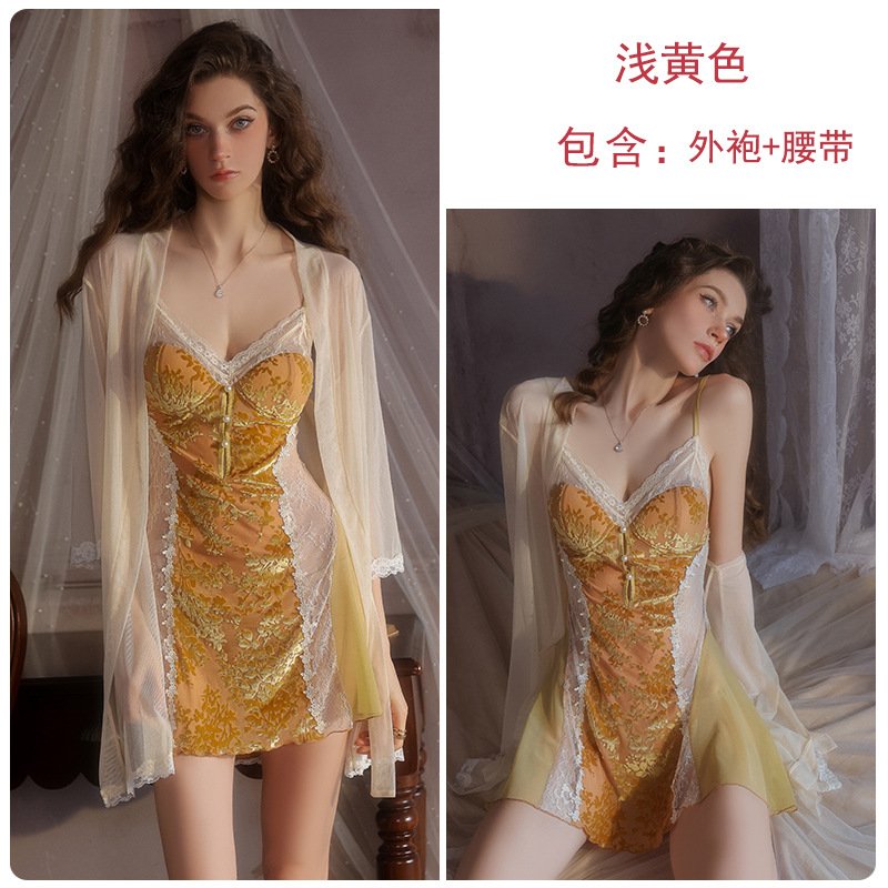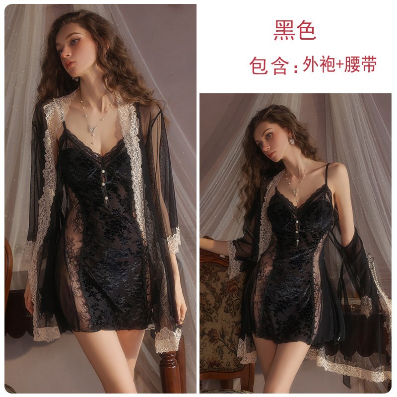 瑰若纯欲诱惑丝绒睡衣激情深V加胸垫性感睡裙网纱外袍女套装