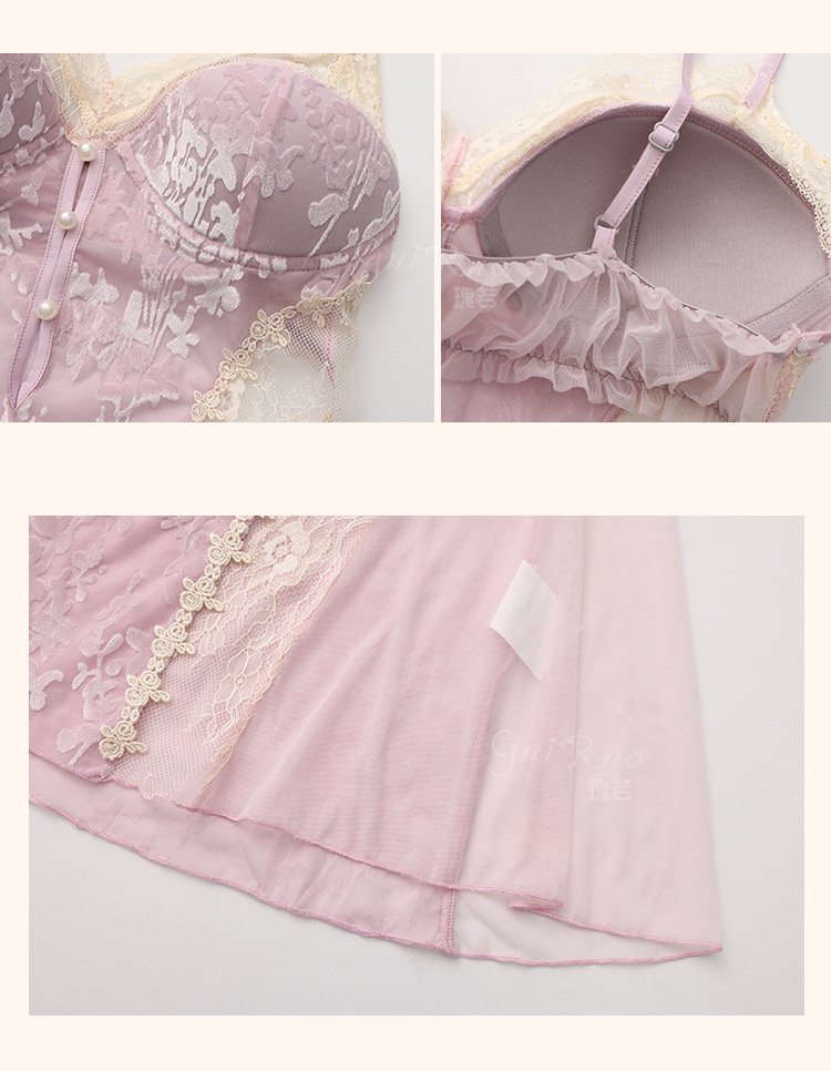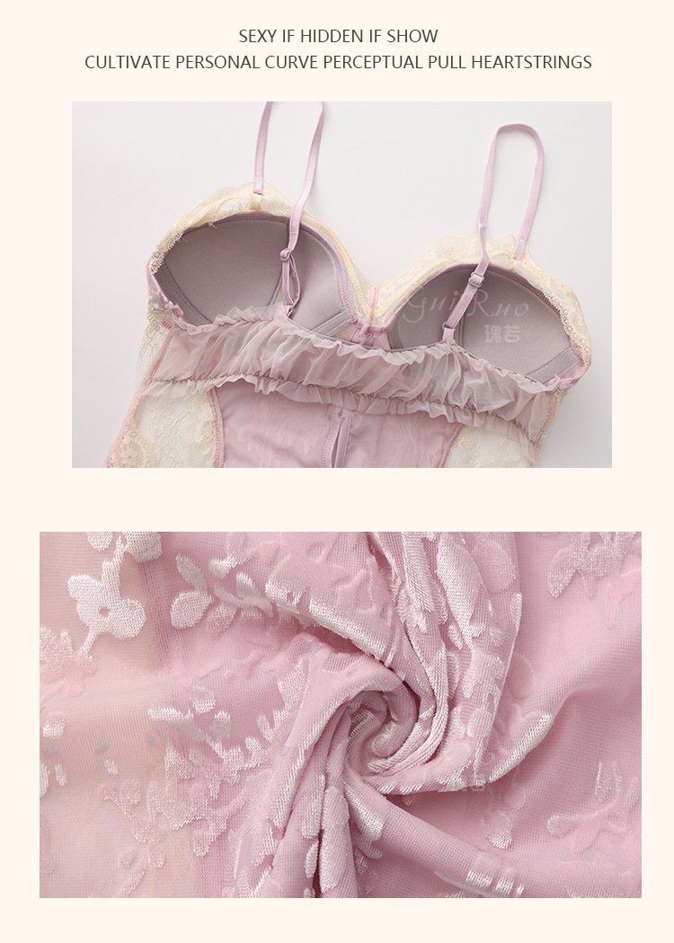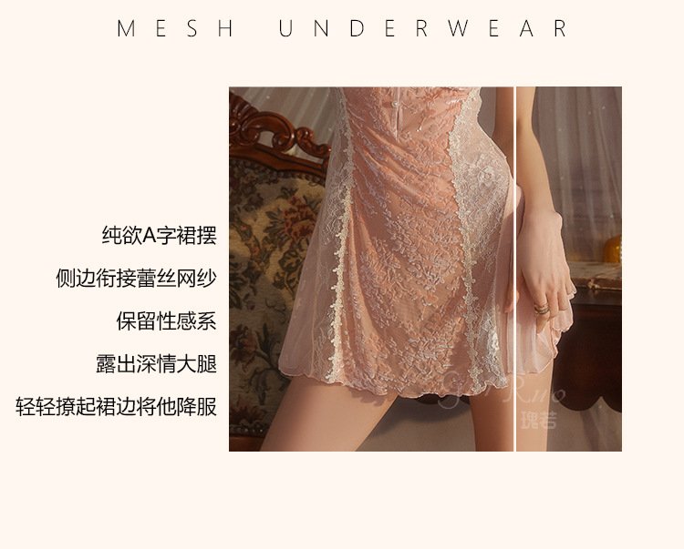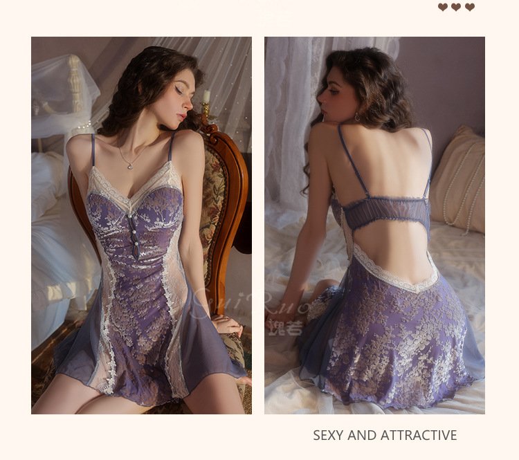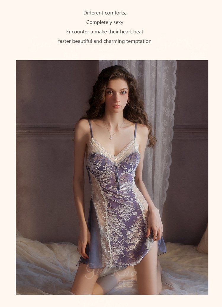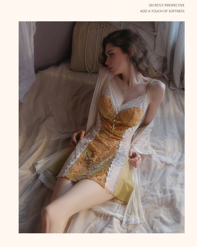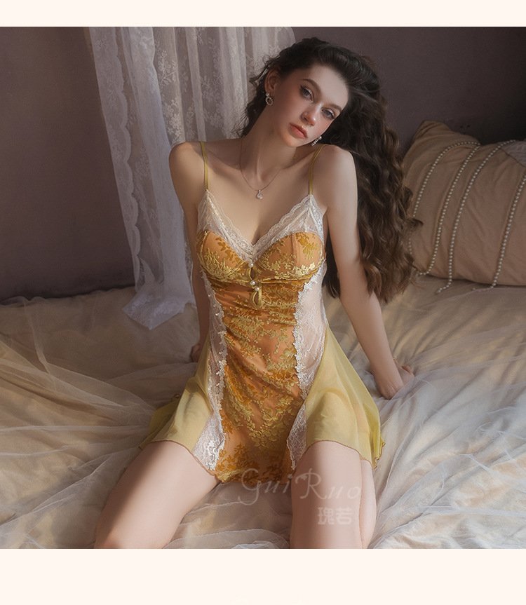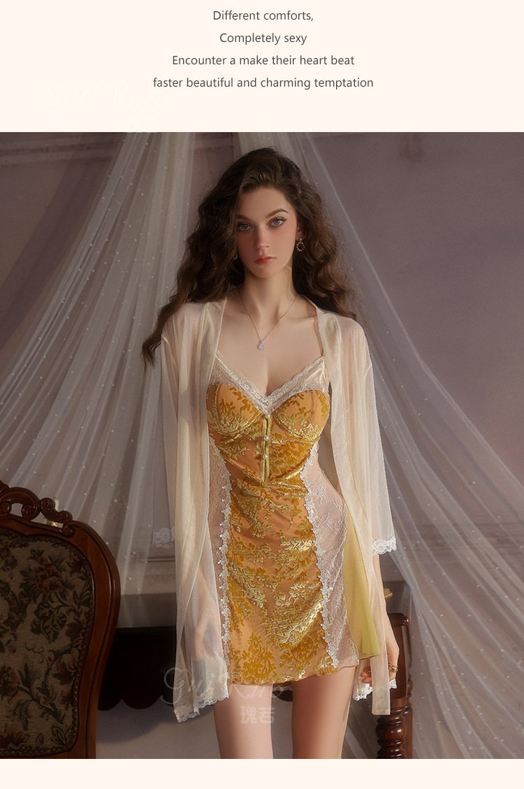 瑰若纯欲诱惑丝绒睡衣激情深V加胸垫性感睡裙网纱外袍女套装